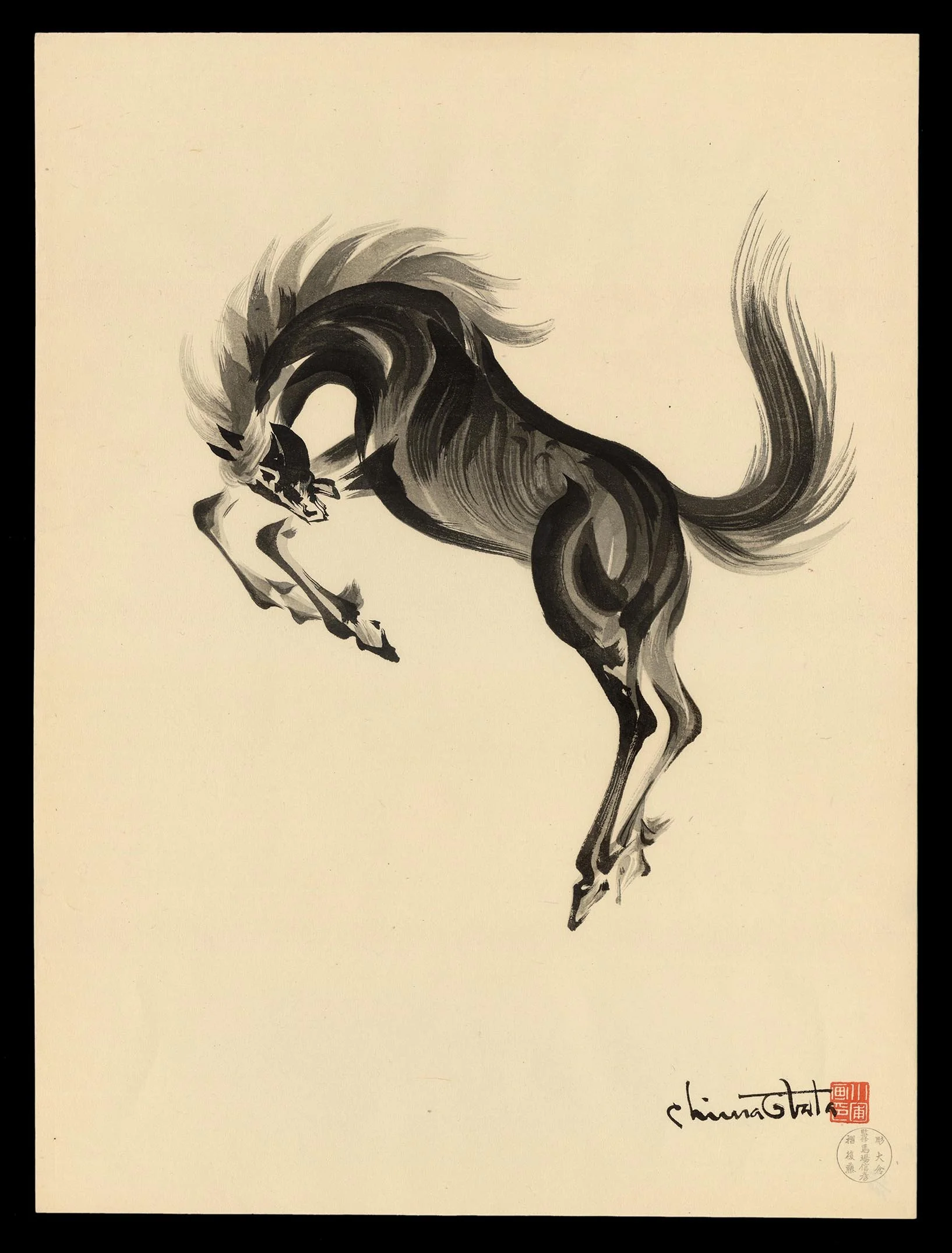Though best known for his sweeping landscapes of Yosemite and the High Sierra, Obata’s mastery of ink brushwork—refined over years of training in Japan—found its most distilled and expressive outlet in his depictions of animals. This particular impression, one of a handful of variants in this prancing horse series, is characterized by its harmony of line and gesture, suggestive of calligraphic spontaneity yet grounded in the artist’s deep anatomical understanding.