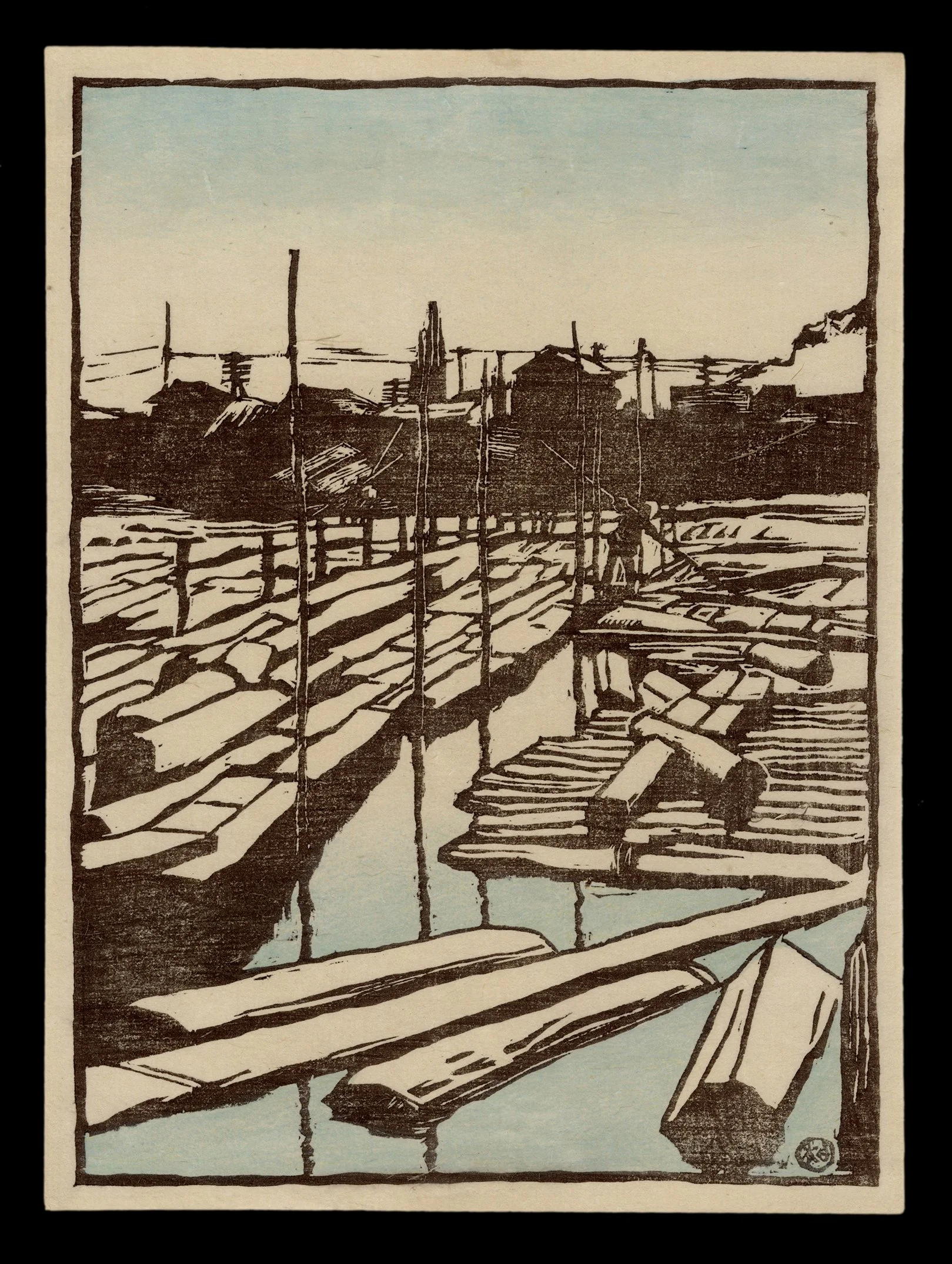 With Lumberyard, created in 1914, Ishii Hakutei offers a strikingly modern vision of work, material, and introspection—at once a document of a changing Japan and an allegory for the creative act itself. The composition captures a solitary figure among immense stacks of timber, walking through the flooded yard with measured deliberation. The artist uses a stark interplay of line and negative space to evoke the raw weight and rhythm of the logs, their quiet reflections fracturing across the water like echoes. In the distance, the skeletal outline of a modernizing urban skyline looms, rendered in silhouette.