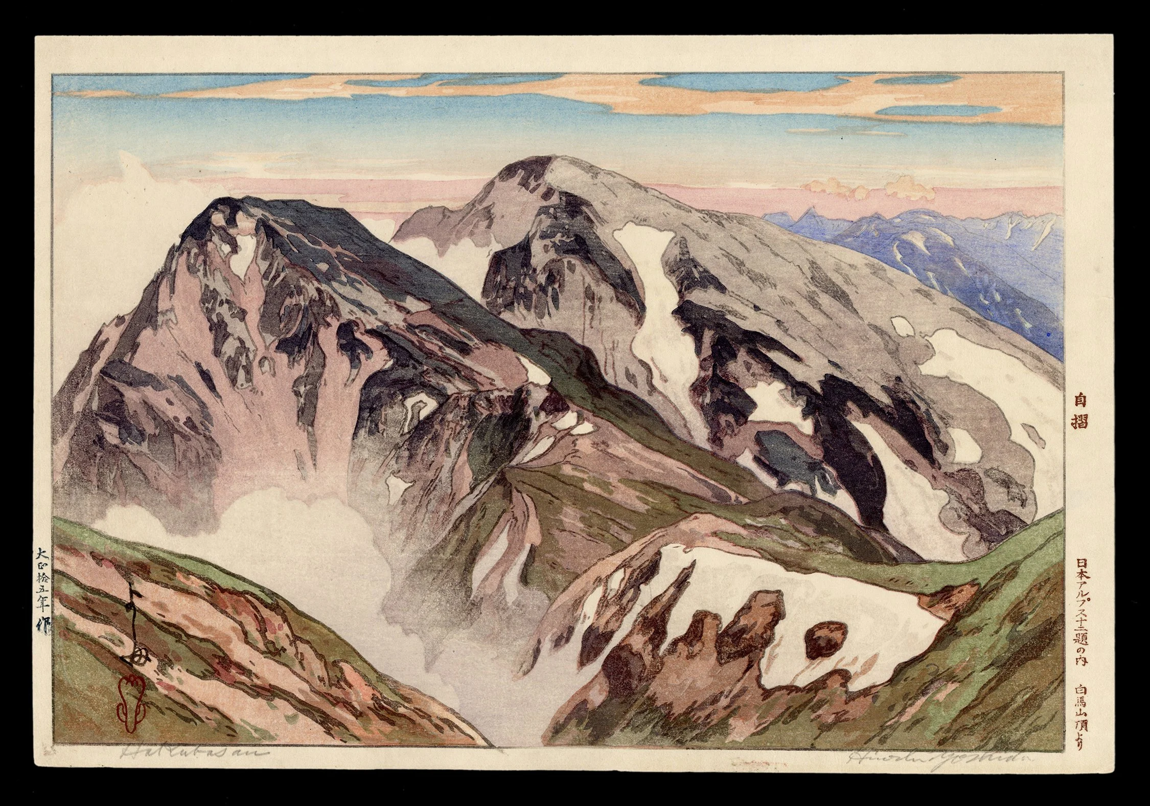 Published in 1926 as part of his celebrated Japanese Alps series, Yoshida's composition is as much about the sculptural forms of nature as it is about atmosphere. The layering of lavender shadows, soft blushes of sunlit rock, and the lingering veil of morning mist conjure a hush appropriate to the mountain’s spiritual resonance. The horizontal orientation emphasizes the expanse and undulation of the range, inviting the viewer into a highland world above the clouds, where stillness reigns.