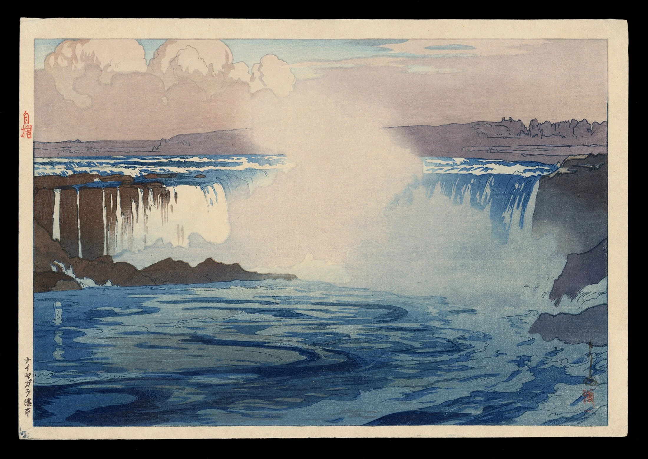 Unlike many Western portrayals of Niagara that lean into spectacle, Yoshida approaches the falls as he might a sacred site in Japan—a place of elemental beauty imbued with spiritual presence. The symmetry of sky, spray, and water create a sense of sublime balance. The use of color is particularly masterful, with the muted pastels of sky and cloud contrasting with the deep, hypnotic blues of the eddies and plunge basin. It is a visual poem to nature’s grandeur, held in contemplative suspension.