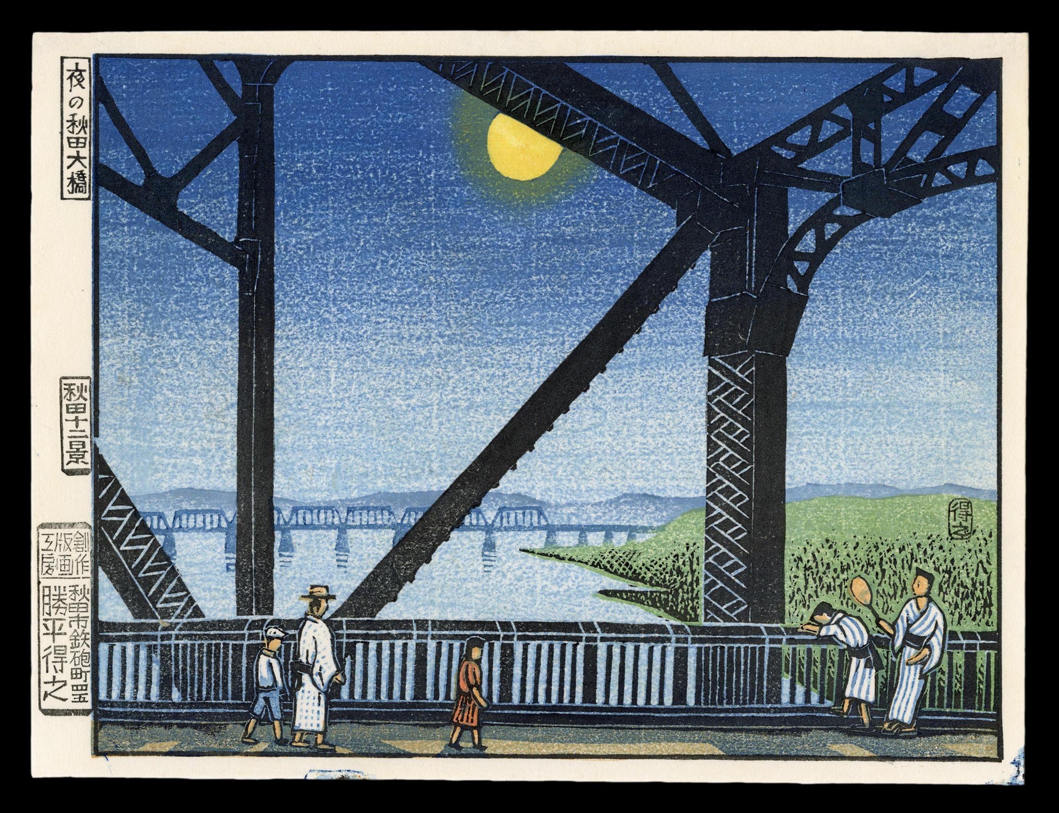 As an adherent of the Sosaku Hanga movement, Katsuhira Tokushi embraced the philosophy of the artist as sole creator—designing, carving, and printing each work himself. Night View of the Great Bridge in Akita exemplifies this spirit, combining technical rigor with expressive depth. Unlike many contemporaries who looked to Kyoto or Tokyo for subjects, Tokushi centered his gaze on Akita, capturing its quiet transformation as Japan edged deeper into the modern era.