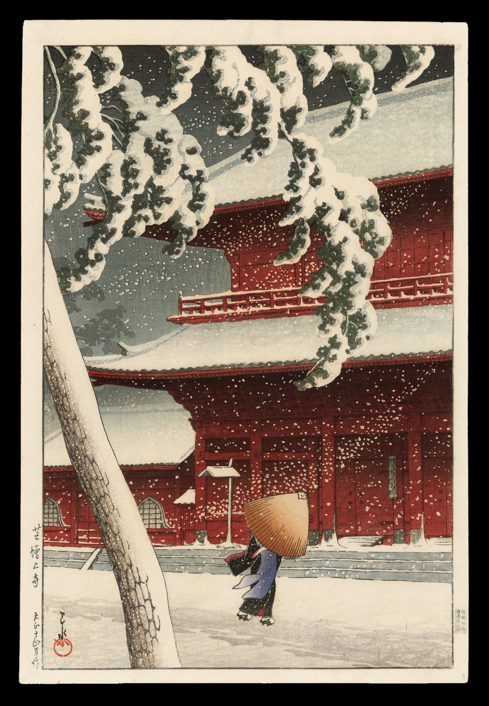 Rendered with extraordinary sensitivity, Hasui’s print balances structure with atmosphere. The bold vermilion of the Zojoji gate glows warmly beneath the snow, while the delicate blue-violet of the traveler’s kimono draws the eye to human presence amid nature’s hush. The softly textured snow on roofs, tree limbs, and the ground below was achieved through careful subtle gradations of bokashi, enhancing the print’s tactile, almost dreamlike quality. In this work, time appears to pause—only the footfalls of the traveler and the silent fall of snow speak.