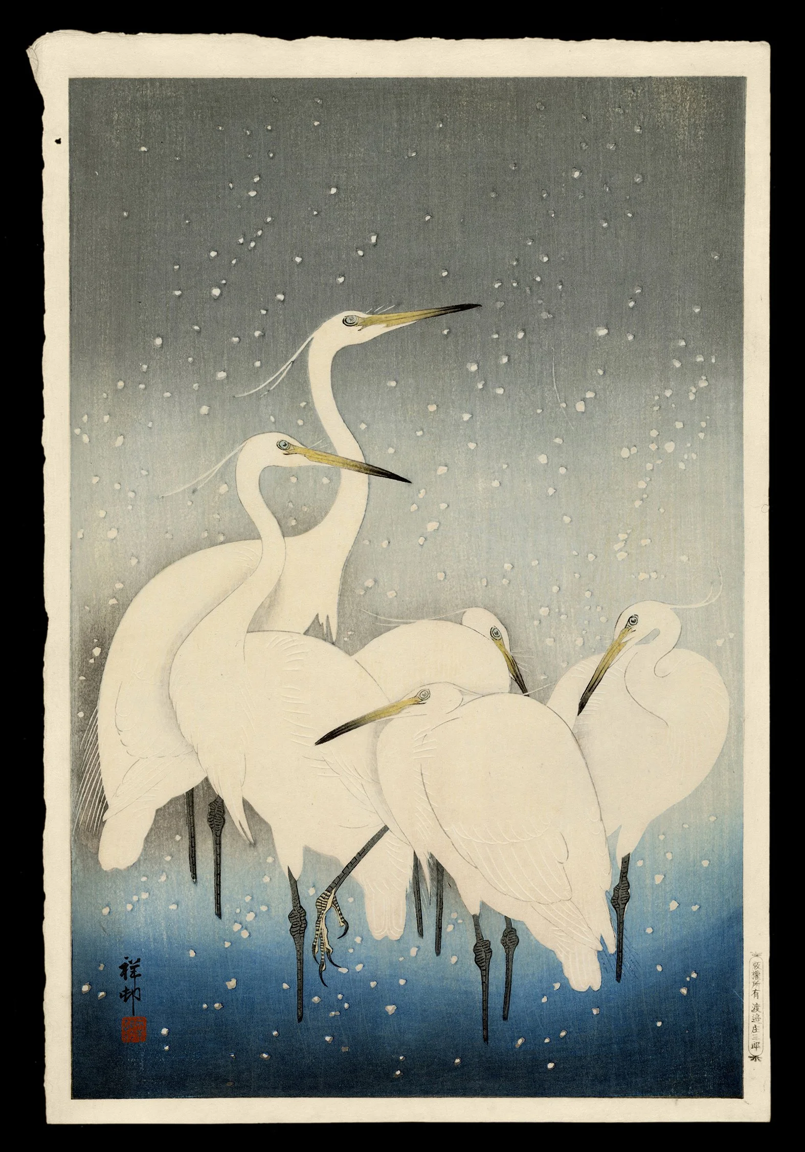 Ohara Shoson is celebrated as the foremost kacho-ga artist of the Shin Hanga movement, and Egrets in the Snow is widely recognized as one of his signature achievements. A design that is at once formally elegant and emotionally resonant, it embodies the Shin Hanga ideal of merging traditional Japanese aesthetics with Western-influenced naturalism and technical refinement.