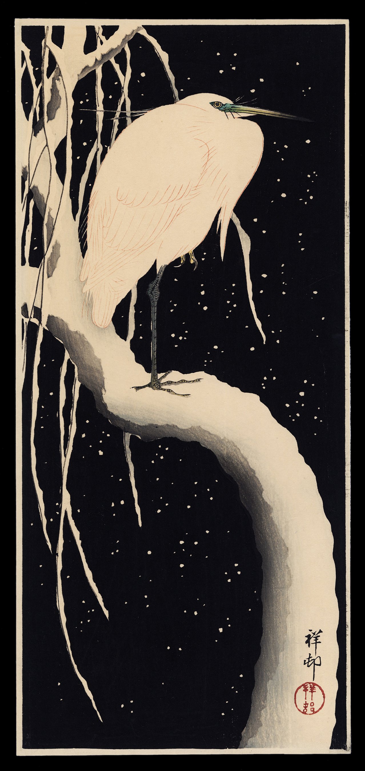 Ohara Shōson (also known as Koson or Hōson, depending on the publisher of the design) is widely regarded as the preeminent bird-and-flower artist of the Shin Hanga movement. While his oeuvre spans a broad range of avian subjects, it is his images of white egrets—often poised in snow—that are among the most iconic and enduring.