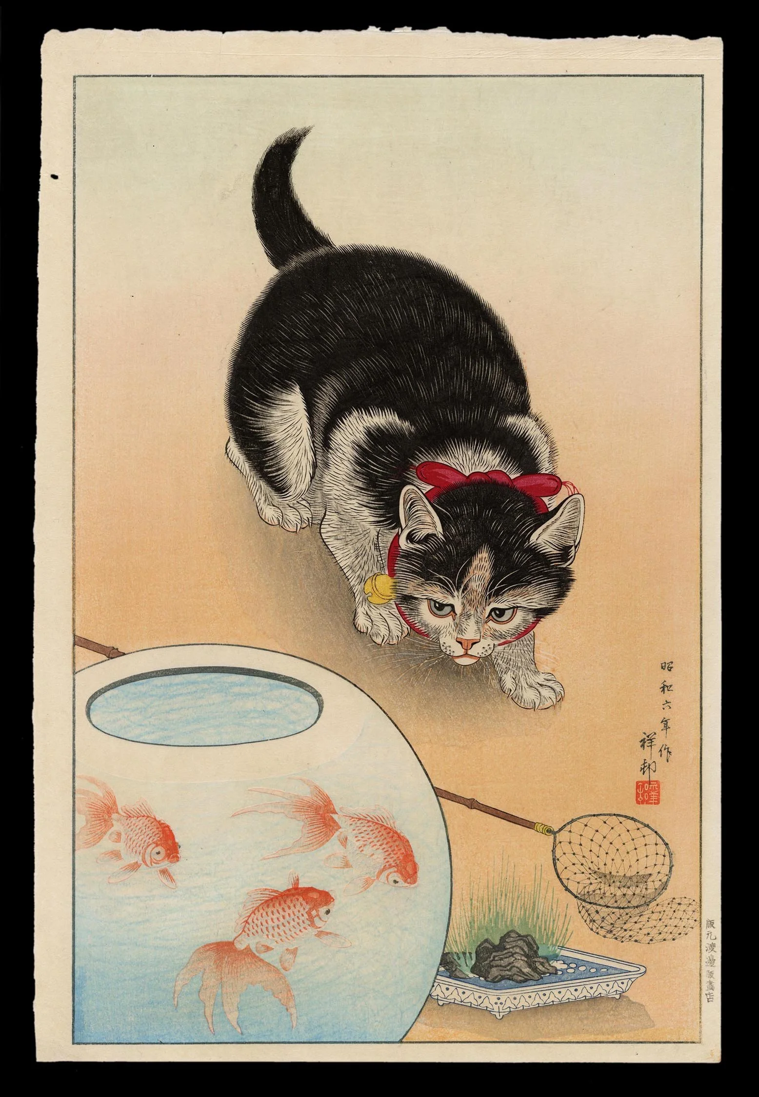 Ohara Shoson, celebrated for his kacho-e (bird-and-flower prints), reveals in this 1933 work a lighter, more playful dimension of his artistry. While many of his compositions focus on the elegance of cranes or the poised alertness of hawks, this print channels the quieter delight of everyday moments. It also demonstrates his technical mastery: the fur of the kitten is rendered in finely carved lines, while the watery interior of the bowl shifts in hue with near-translucent delicacy.