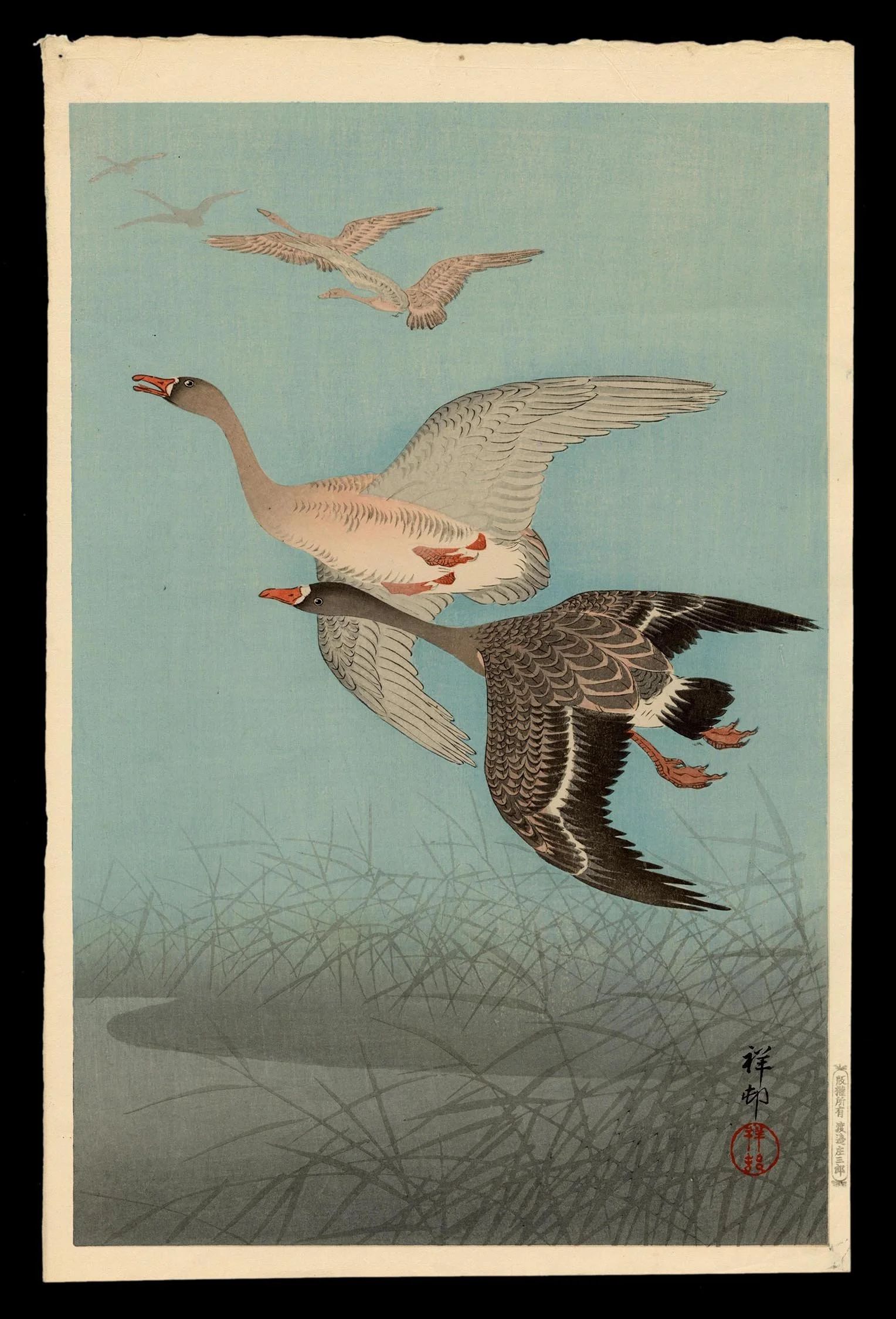 In Wild Geese, a pair of geese in mid-flight cut sharply across a cerulean sky, wings spread in full tension, rendered with the crisp exactitude that characterizes Ohara Shoson’s most refined work. Above them, ghostlike silhouettes of distant geese fade into the pale gradient of air, while delicate reeds and an inky waterline mark the threshold of marshland below. Executed in 1926, this composition belongs to the golden age of Shin-Hanga, where naturalism meets lyrical abstraction.