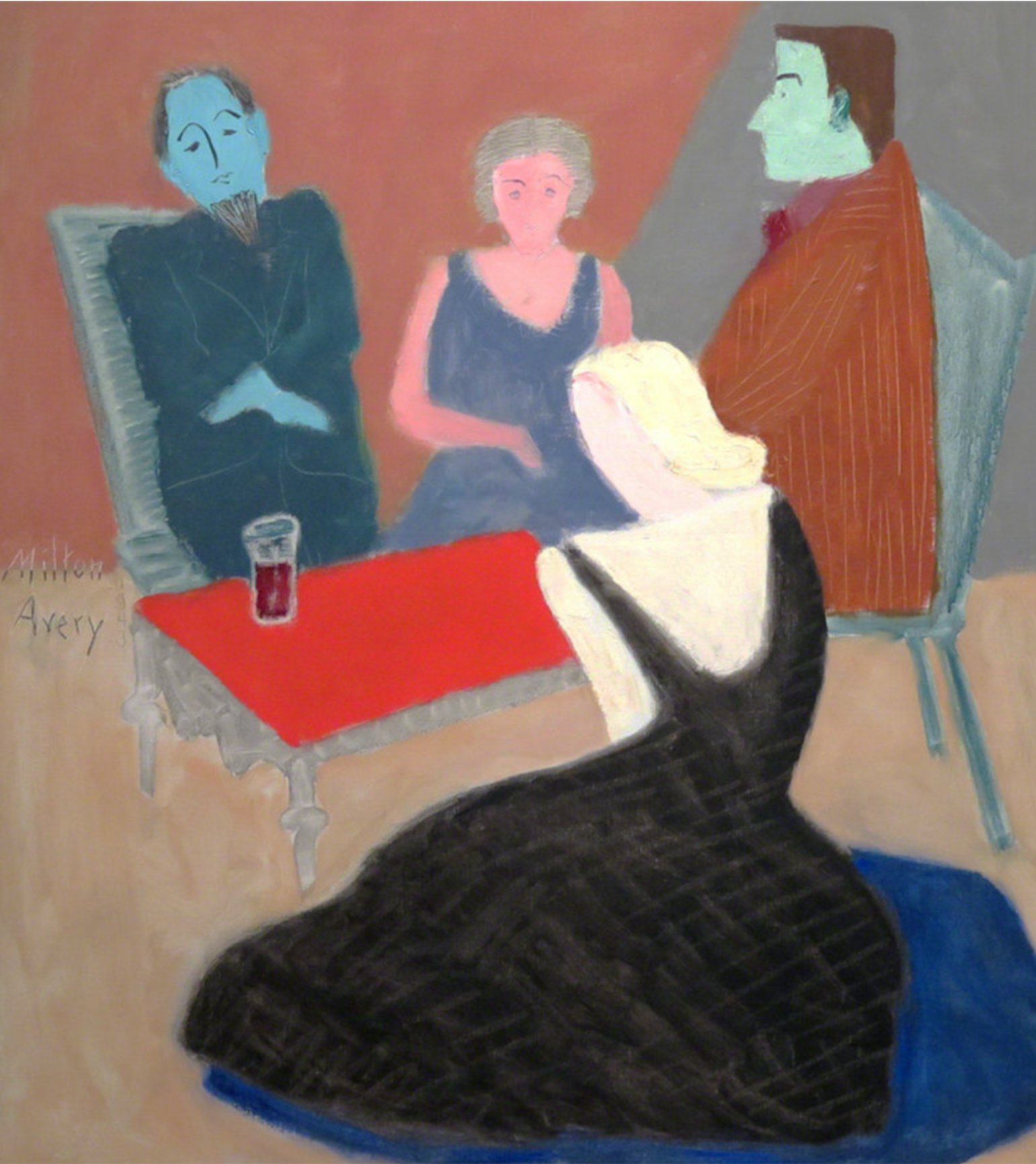 It is interesting to consider how similar this late Hashimoto design is to the work of the great modern colorist Milton Avery. For example, if we take Avery’s work “Conversation in the Studio, 1943,” pictured below, we see striking connections. Like Hashimoto’s portrait, Avery creates his design from blocks of color. The contrasting colors and shapes animate the otherwise introspective scene. It is also interesting to note how Avery’s colors are applied rather unevenly, almost mimicking the effect of bokashi found in Japanese woodblock printing. It is not known if Hashimoto had Avery’s work in mind, but it is interesting to ponder how the style of these two artists intersect. With respect to Hashimoto, it took years of editing representational designs to come to the understanding of Avery’s simplification. This Hashimoto design may very well be one of the last crowning achievements in his late-period style.