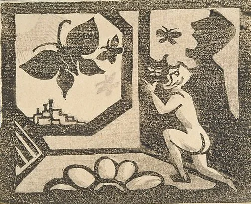 Taninaka Yasunori was a sosaku hanga artist that danced to the beat of his own drum. His work draws much of its subject matter from the world of dreams and the subconscious. Taninaka learned the art of printmaking from Nagase Yoshiro in the early 1920s, when Nagase’s designs learned toward expressionism and later studied etching with Sekino during World War II. Most of Taninaka’s body of work are prints produced for small sosaku hanga magazines, such as Shiro to Kuro (White and Black). Though he made a reasonably good livelihood from his art, Taninaka was known to be thriftless. Near the end of the war, his home was destroyed in an air raid, and he found himself living in a temporary shack and sustaining himself with a small crop of pumpkins he was tending in the ruins of his home. Tragically, he died of malnutrition in 1946.