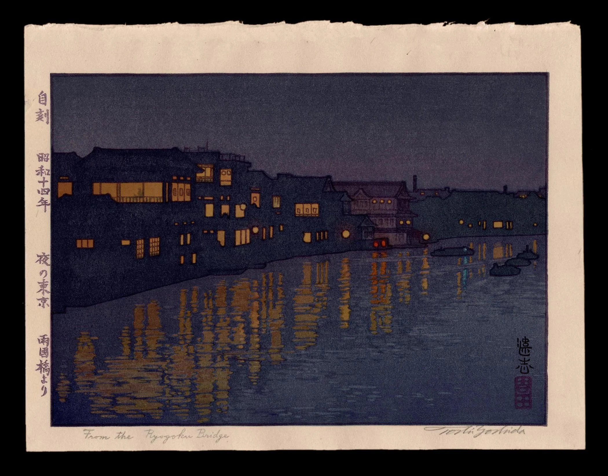 From the Ryōgoku Bridge (1939) is an atmospheric evening view of the Sumida River in Tokyo, rendered with Toshi Yoshida’s signature blend of compositional restraint and tonal sensitivity. The print depicts a line of low-slung riverside teahouses and dwellings, their silhouettes darkened against the indigo sky. Soft, golden light spills from windows and doorways, mirrored in the gently rippling water below in luminous vertical streaks. Boats float quietly along the edge of the river, echoing the stillness of the coming night.
