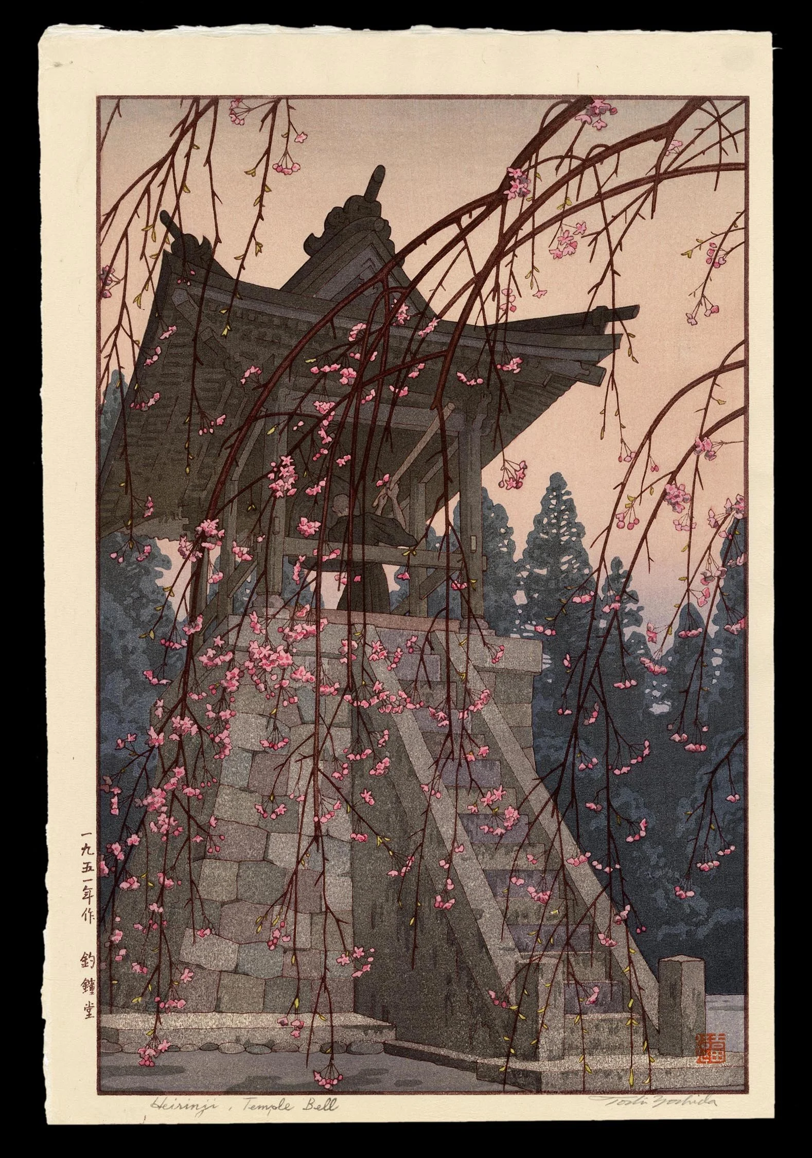 Toshi Yoshida (1911–1995), continuing the legacy of his father Hiroshi Yoshida, brought a distinctly modern sensibility to the Shin-Hanga tradition. Heirinji Temple Bell, produced in 1951, represents a mature expression of his ability to merge technical craftsmanship with emotional resonance. While the print is a study in compositional harmony—combining the vertical lines of pine and bell tower with the gentle sway of sakura branches—it is the small, human detail of the monk preparing to strike the bell that lends the work its profound sense of presence.