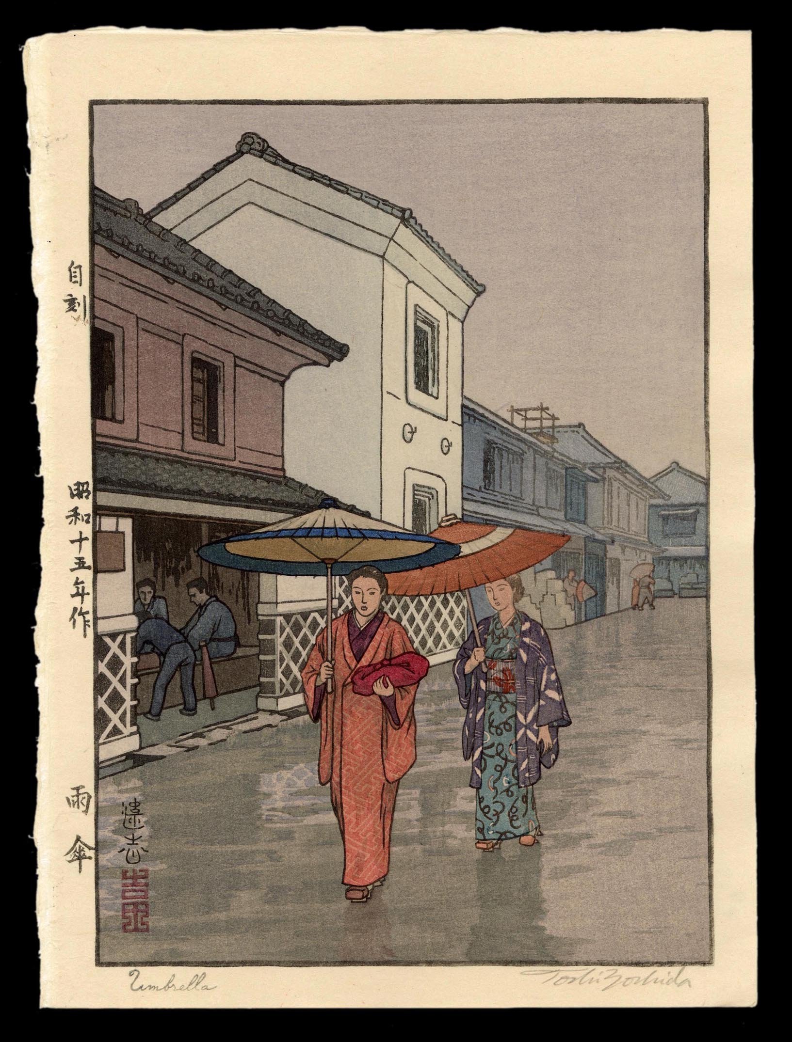 Created in 1941, Umbrella is one of Toshi Yoshida’s most evocative urban scenes from his early career. Here, he merges architectural clarity with the sensitivity of genre painting, focusing not on a famous landmark but on the poetry of ordinary moments. The interplay of wet surfaces, soft lighting, and textile patterning demonstrates Yoshida’s ability to render tactile experience through woodblock—a medium that in his hands becomes capable of remarkable atmospheric nuance.